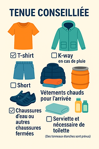 👉 Tenue conseillée : tee-shirt, short, K-way en cas de pluie, vêtements chauds pour l’arrivée,